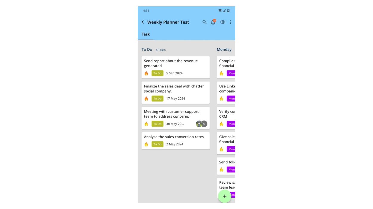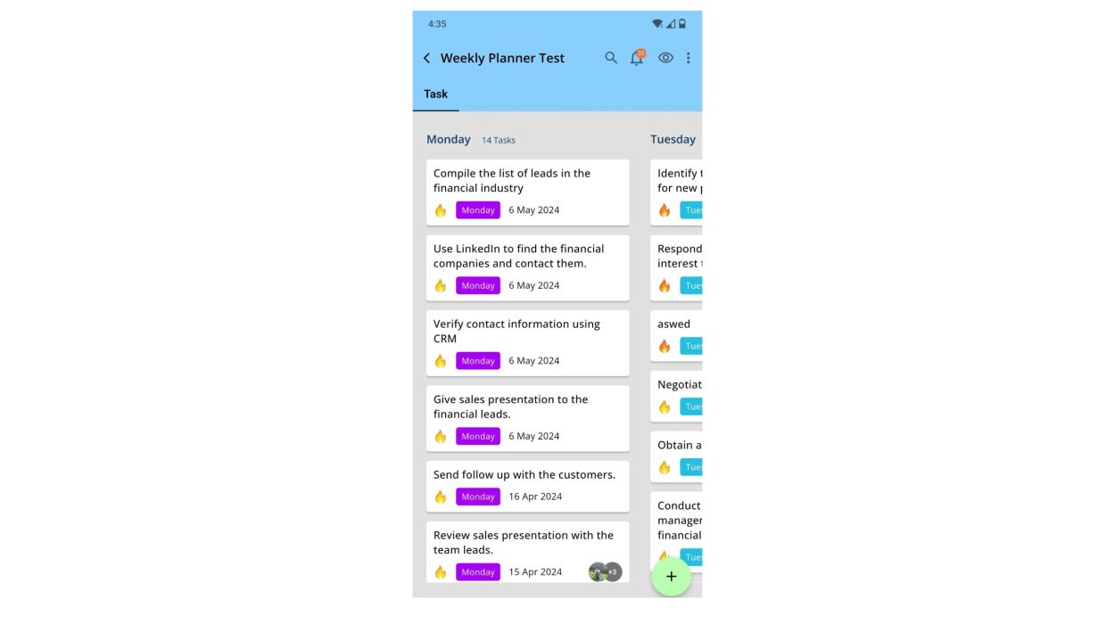 Visualize your entire week at a glance. Effortlessly create tasks and allocate them to specific days, providing a comprehensive overview of your commitments.